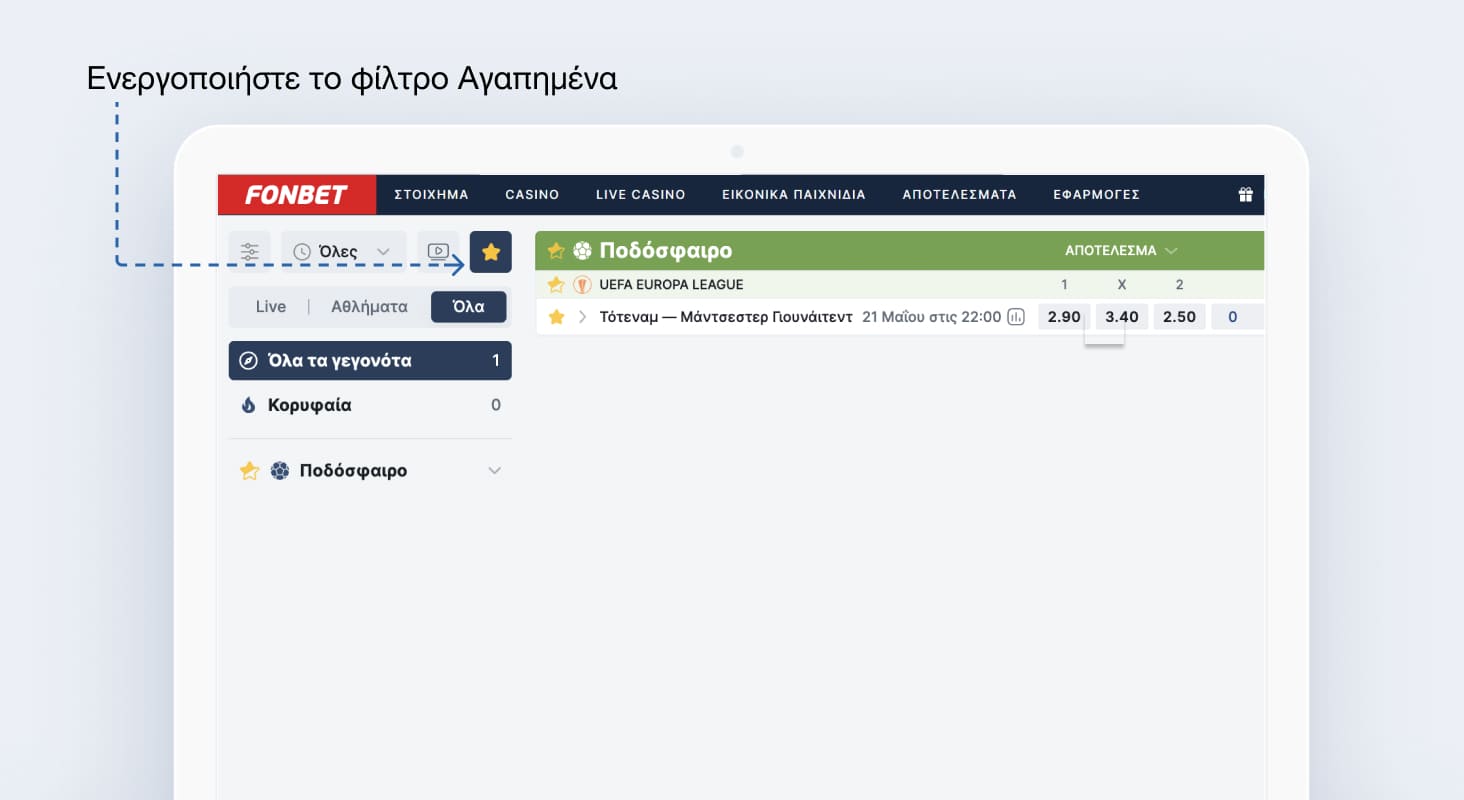 Εάν προτιμάτε να τοποθετείτε συγκεκριμένα στοιχήματα, τότε προσθέστε τα στα αγαπημένα σας. Τα αγαπημένα στοιχήματα θα εμφανίζονται στην καρτέλα «Αγαπημένα» στη σελίδα του αγώνα και θα εμφανίζονται σε όλους τους αγώνες όπου υπάρχουν τέτοιες επιλογές.