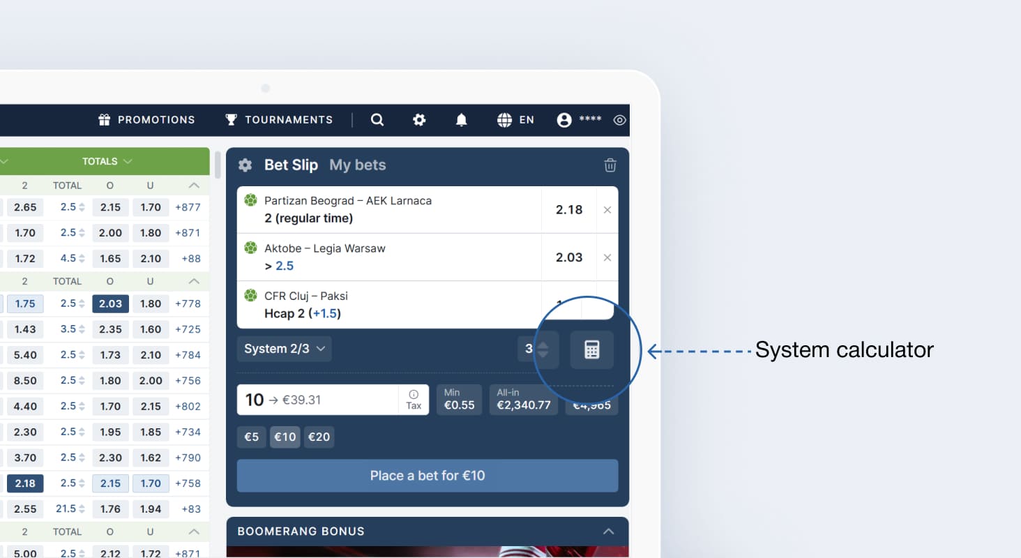 Η Fonbet διαθέτει λειτουργία υπολογισμού συστήματος. Βοηθά στον υπολογισμό των πιθανών κερδών των στοιχημάτων σε διάφορες επιλογές γεγονότων.